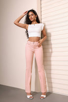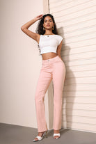 Pantalón recto rosa claro corte entallado, estilo fresco y romántico.