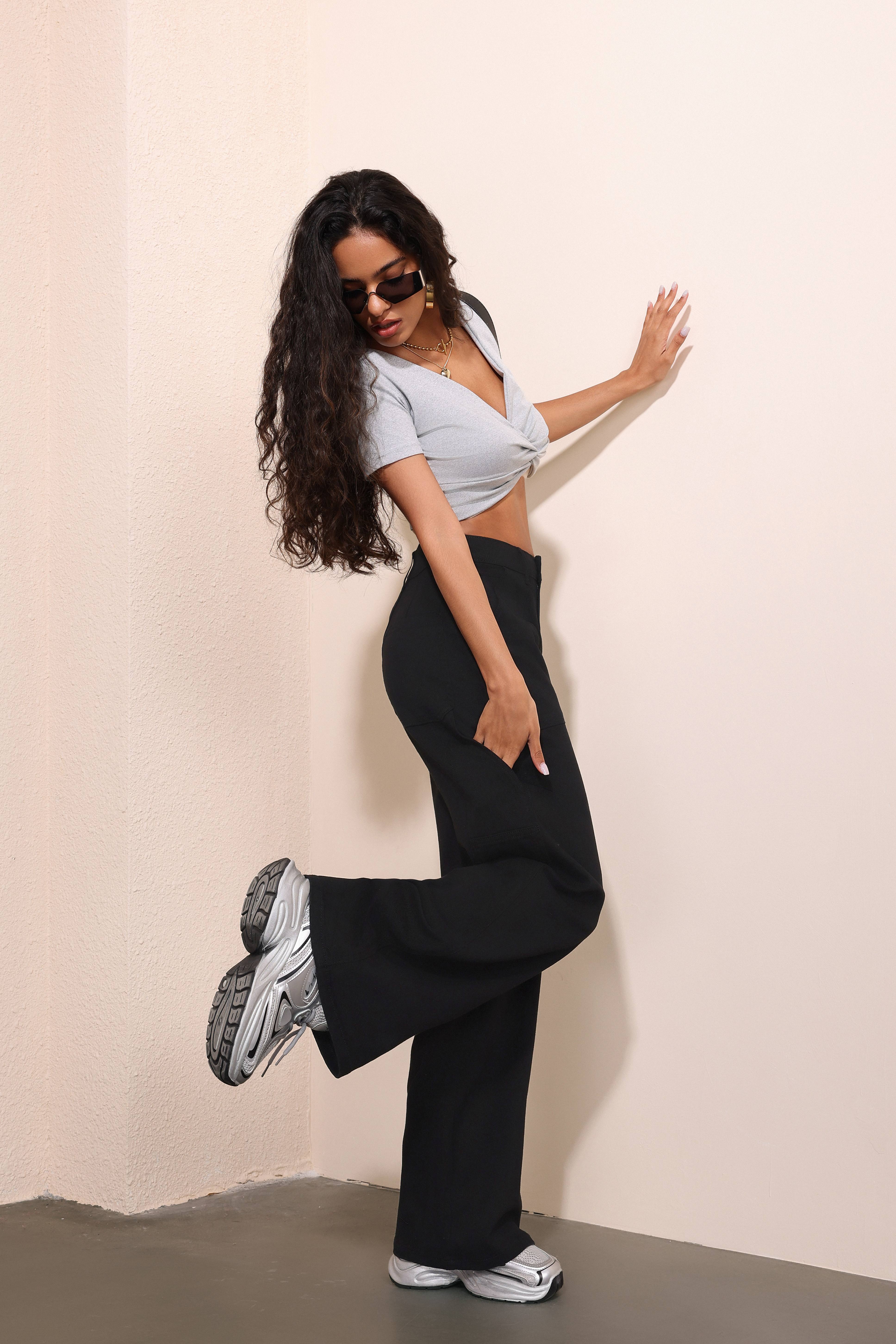 Conjunto de top deportivo de manga larga con diseño cruzado, bolsillos dobles y pantalones anchos con cordón.