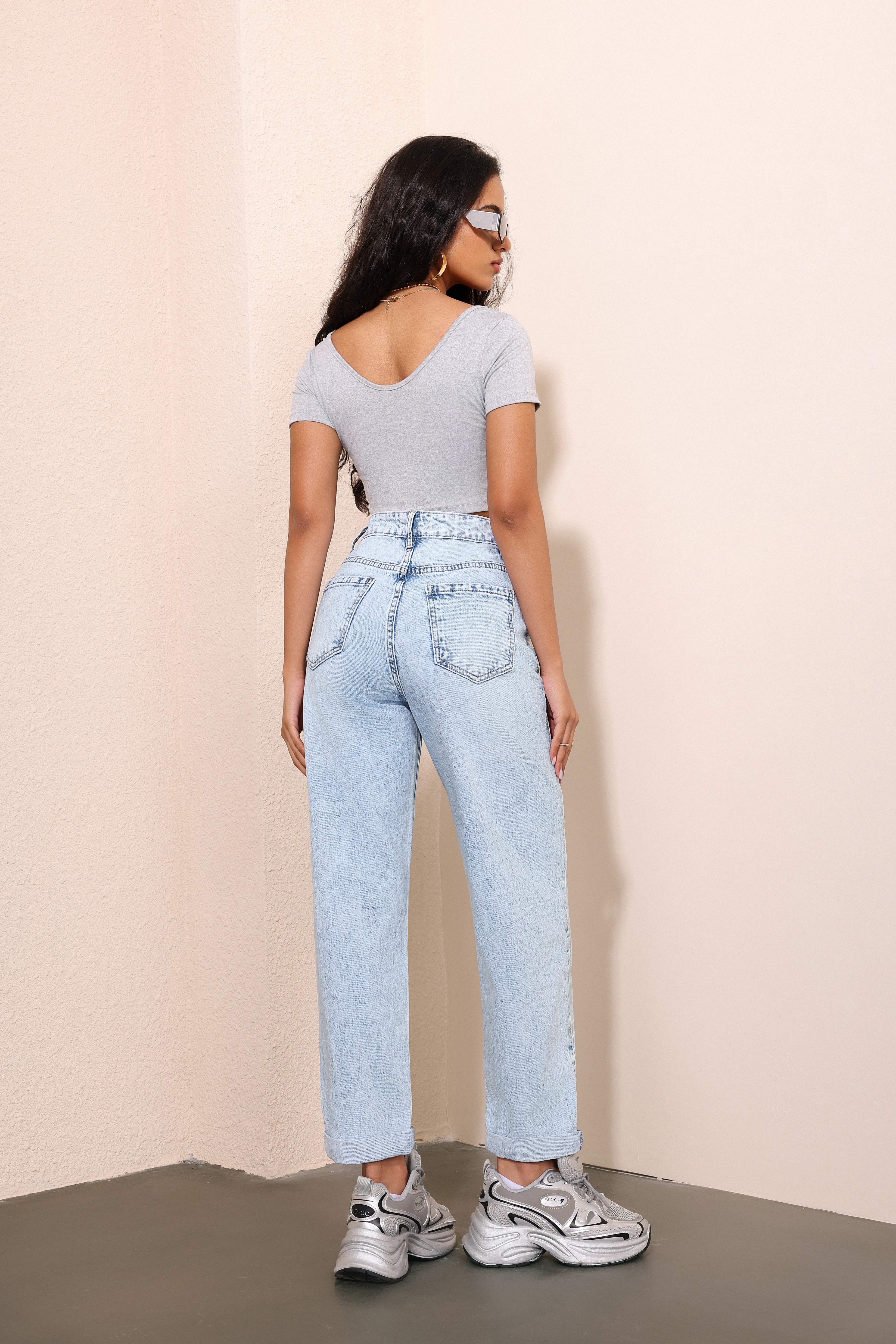 Jeans Amplios de Color Azul Claro Lavado Corte Relajado y Estilo Casual-Chic