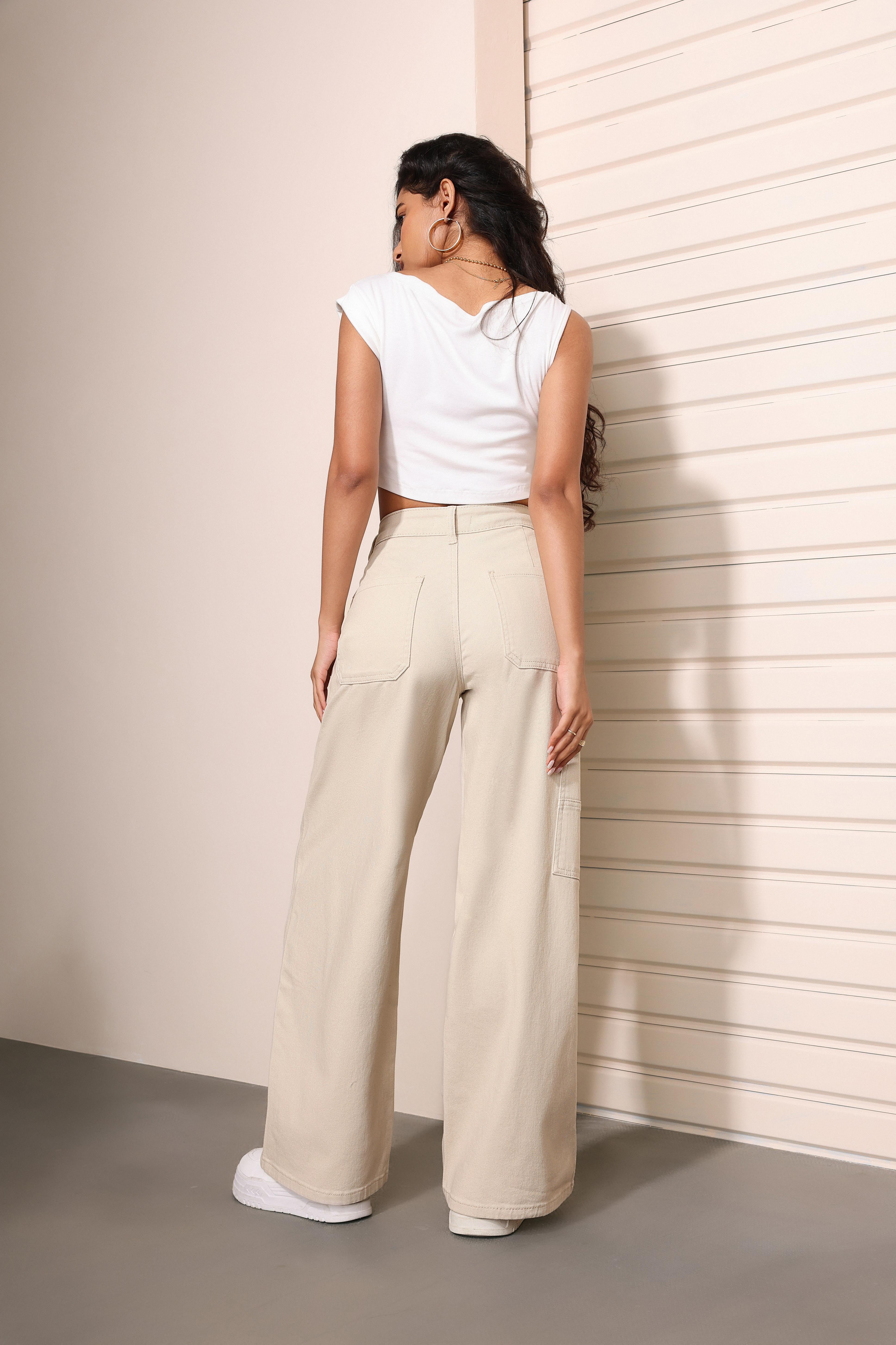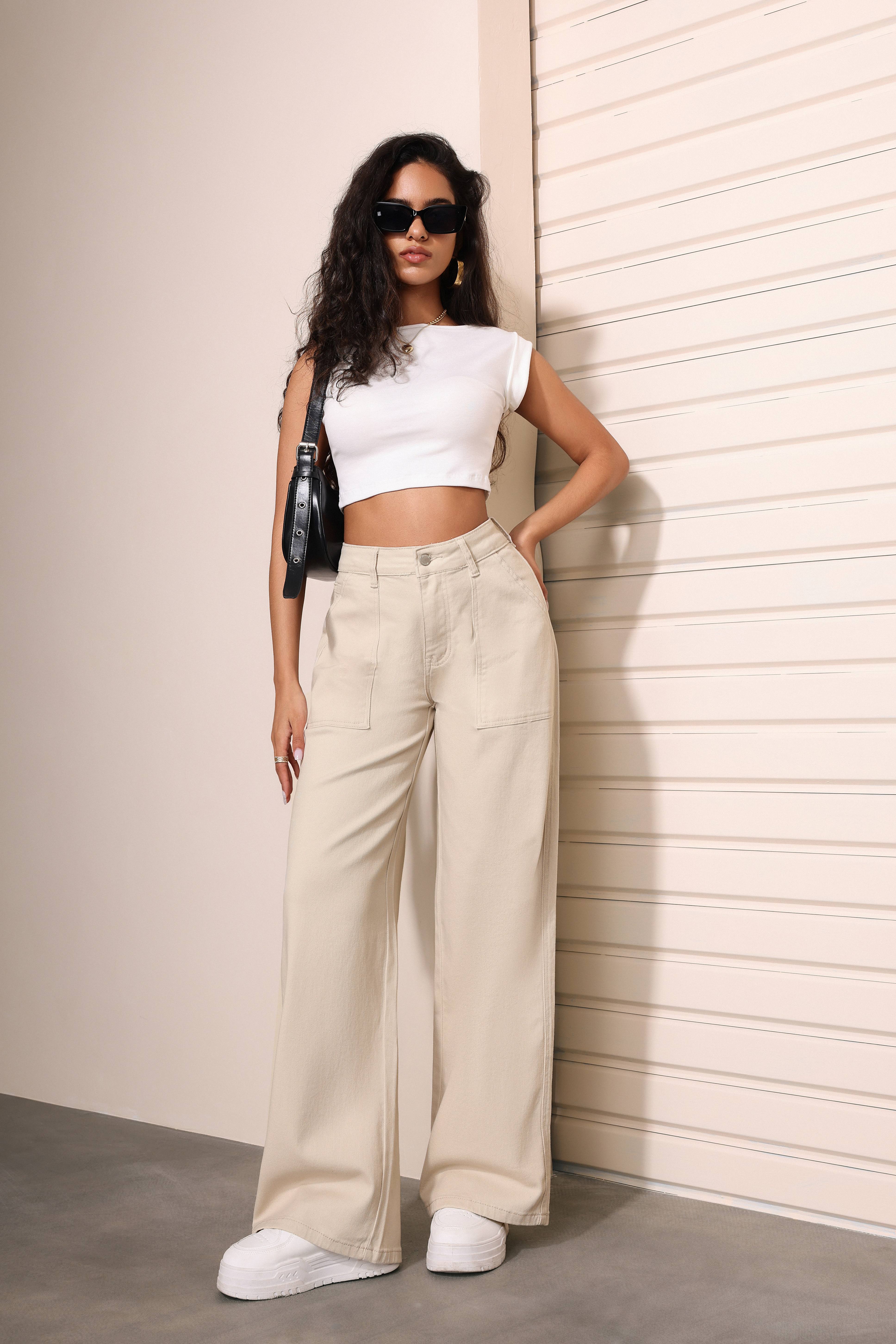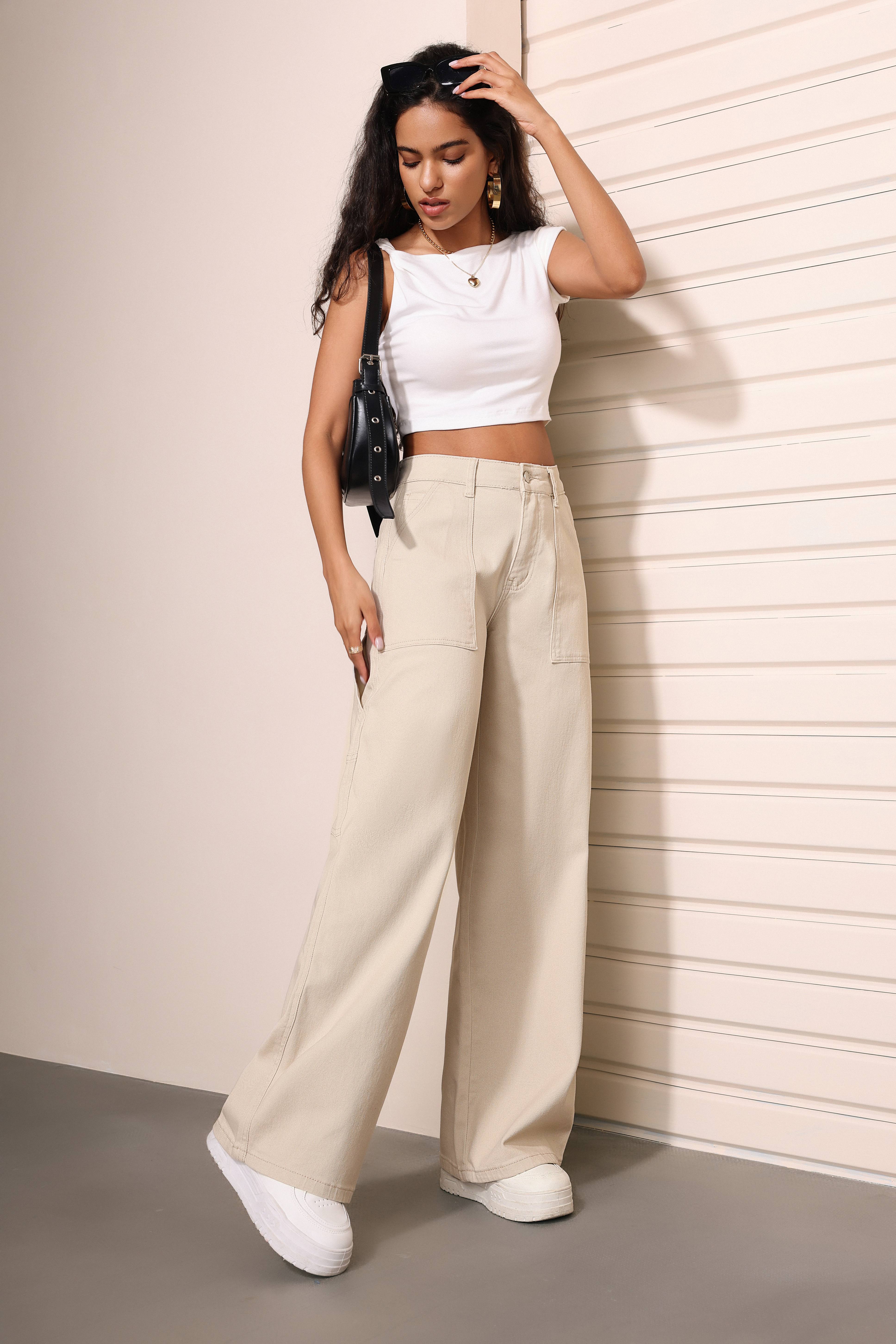 Jeans Anchos Beige Claro Ajustados Ideal para un Estilo Fresco y Elegante