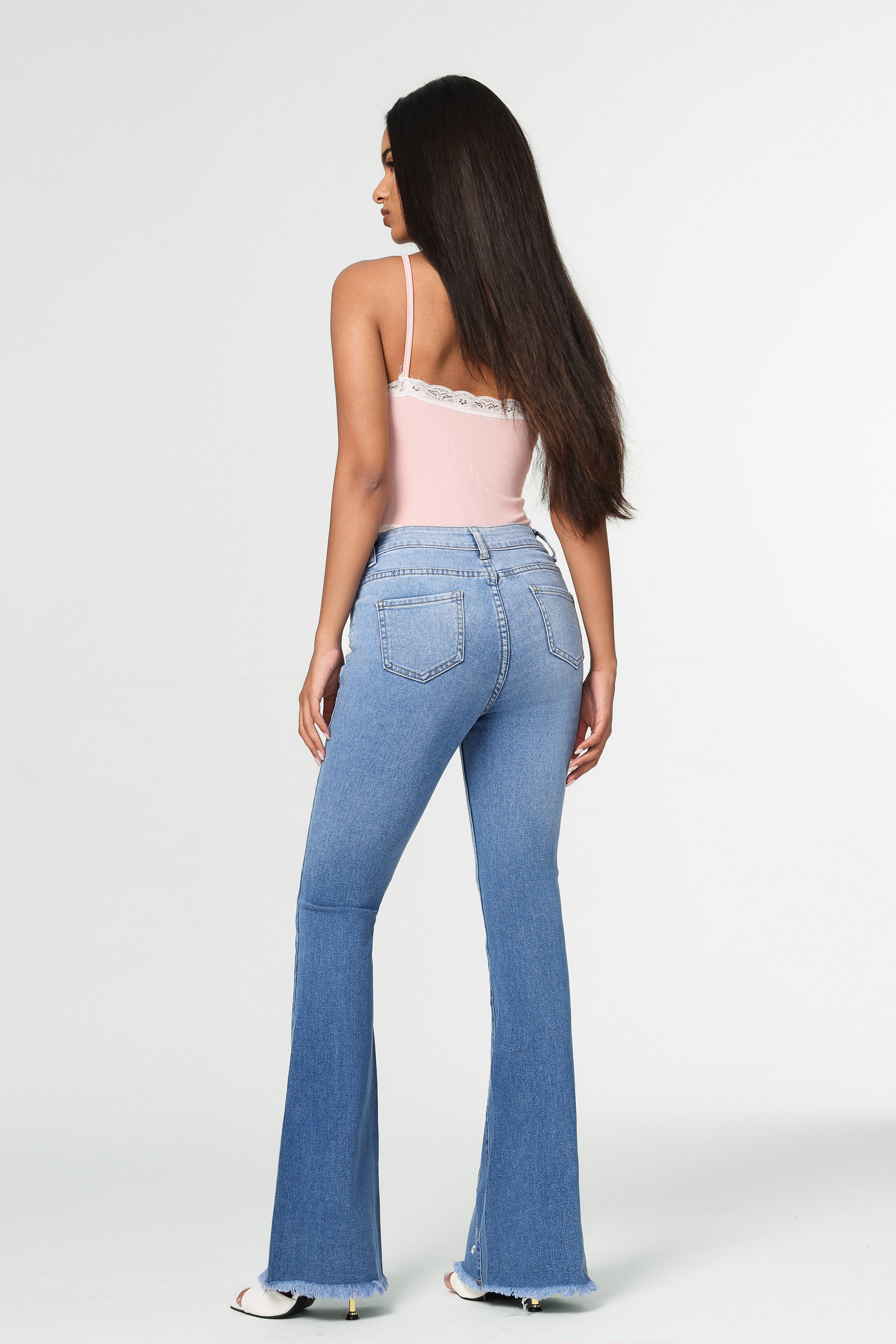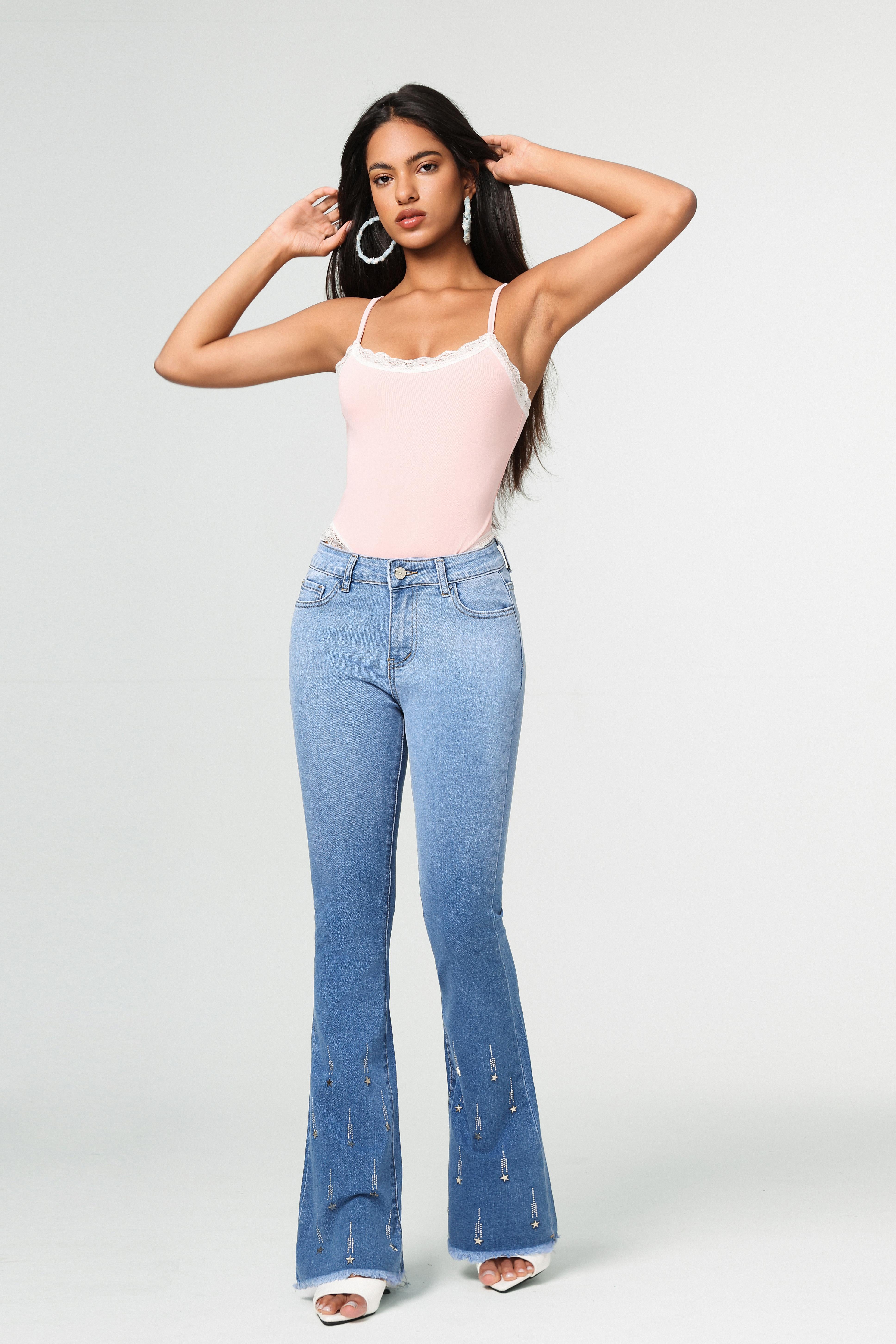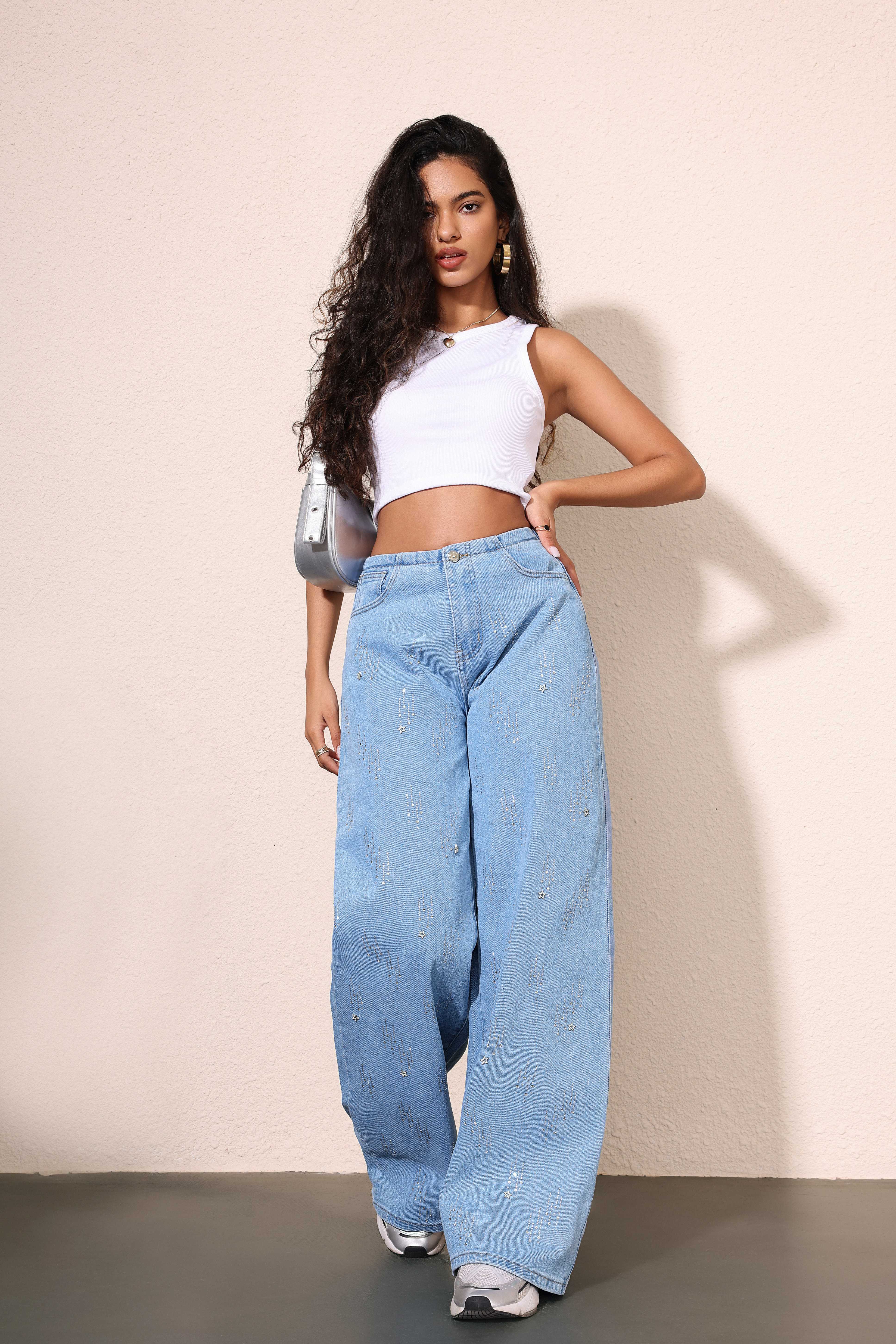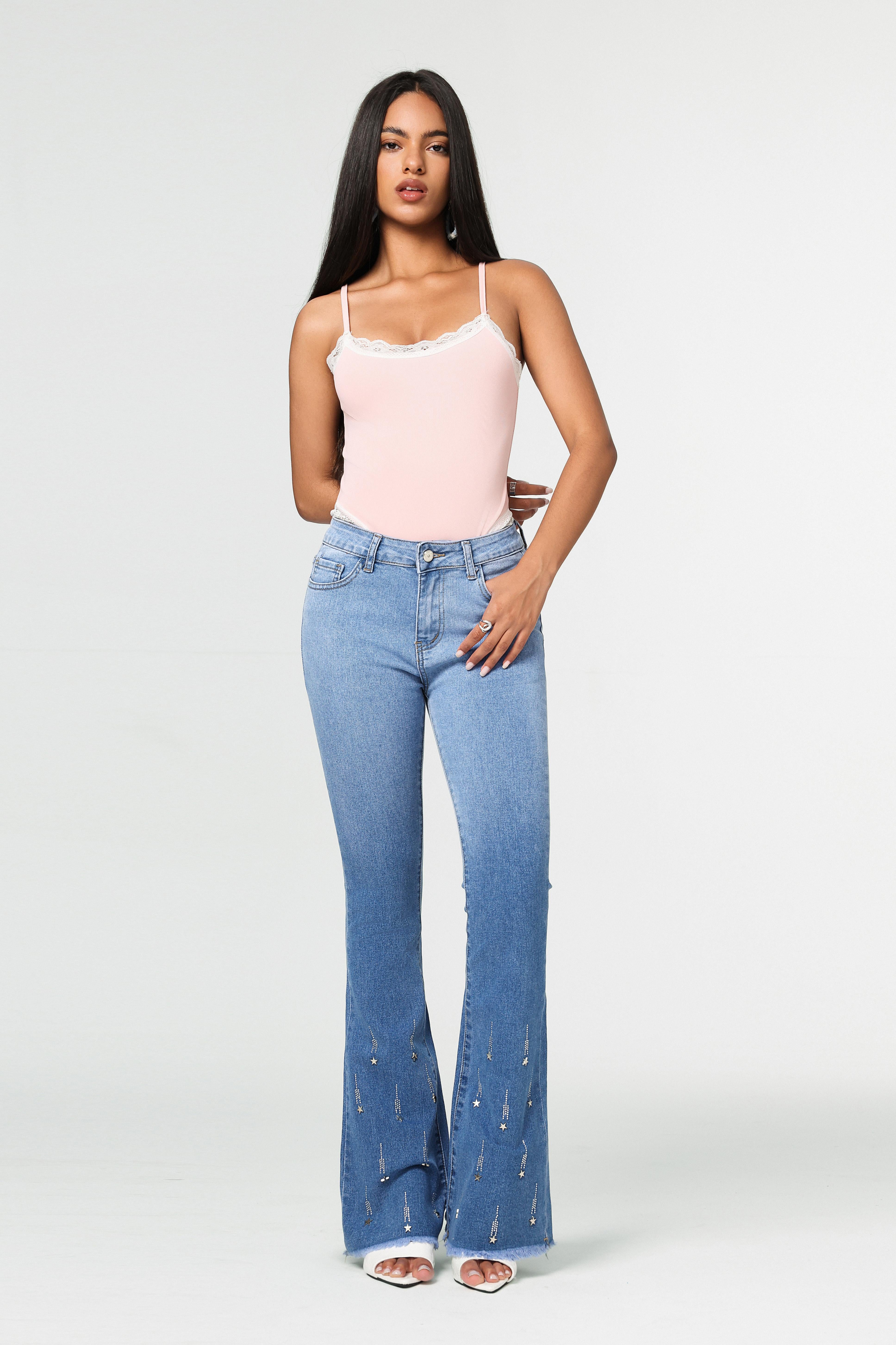 Pantalones acampanados con detalle de estrella en degradado azul claro, estilo moderno y noble.