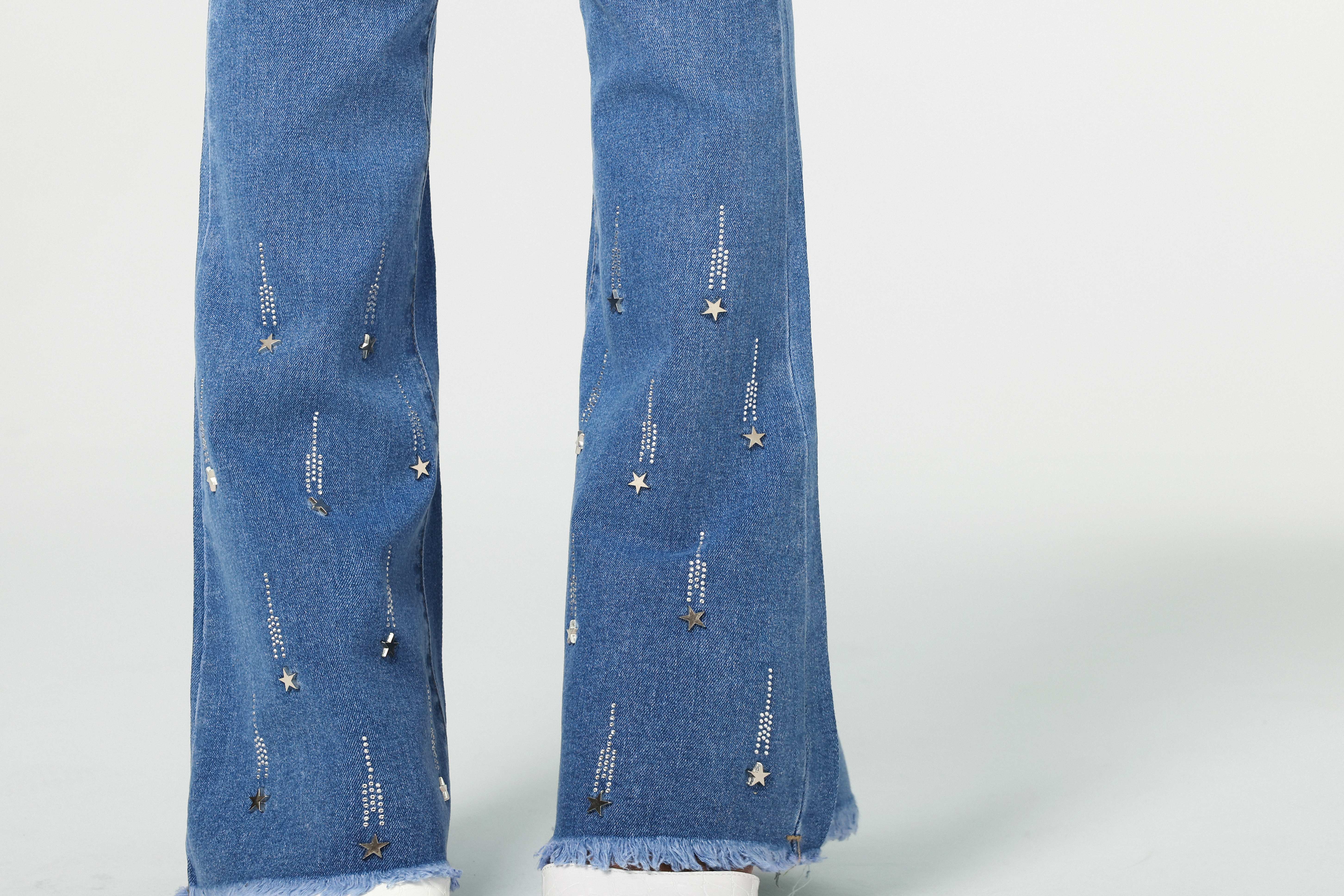 Pantalones acampanados con detalle de estrella en degradado azul claro, estilo moderno y noble.