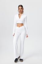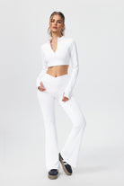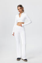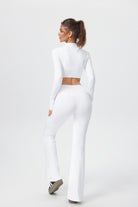 Conjunto deportivo de yoga y pilates con top de manga larga con cuello y cremallera y pantalones acampanados.
