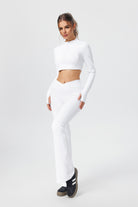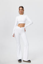 • Los pantalones acampanados complementan el top, ofreciendo libertad de movimiento. Son ideales para mantener la postura y estabilidad en cada rutina.