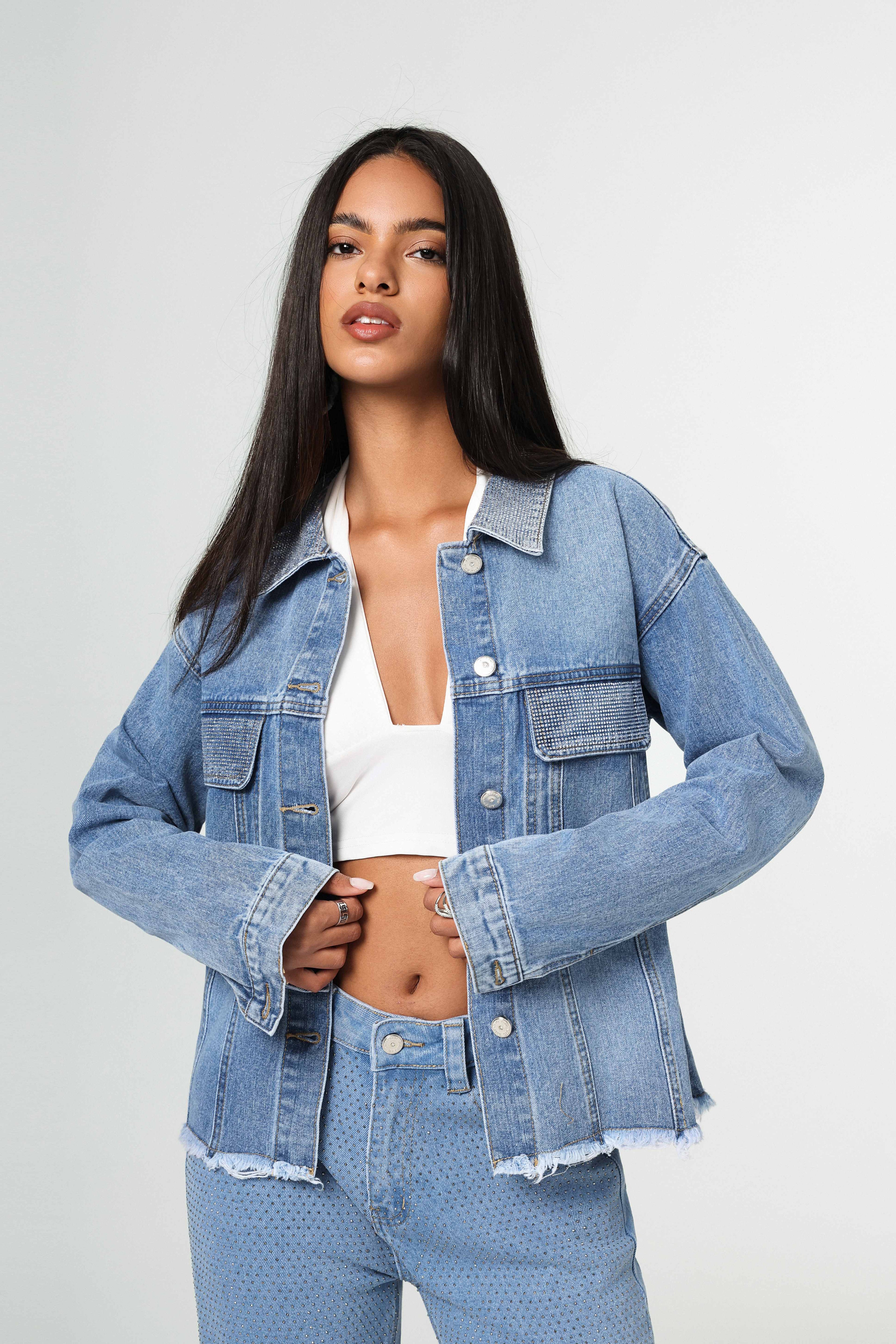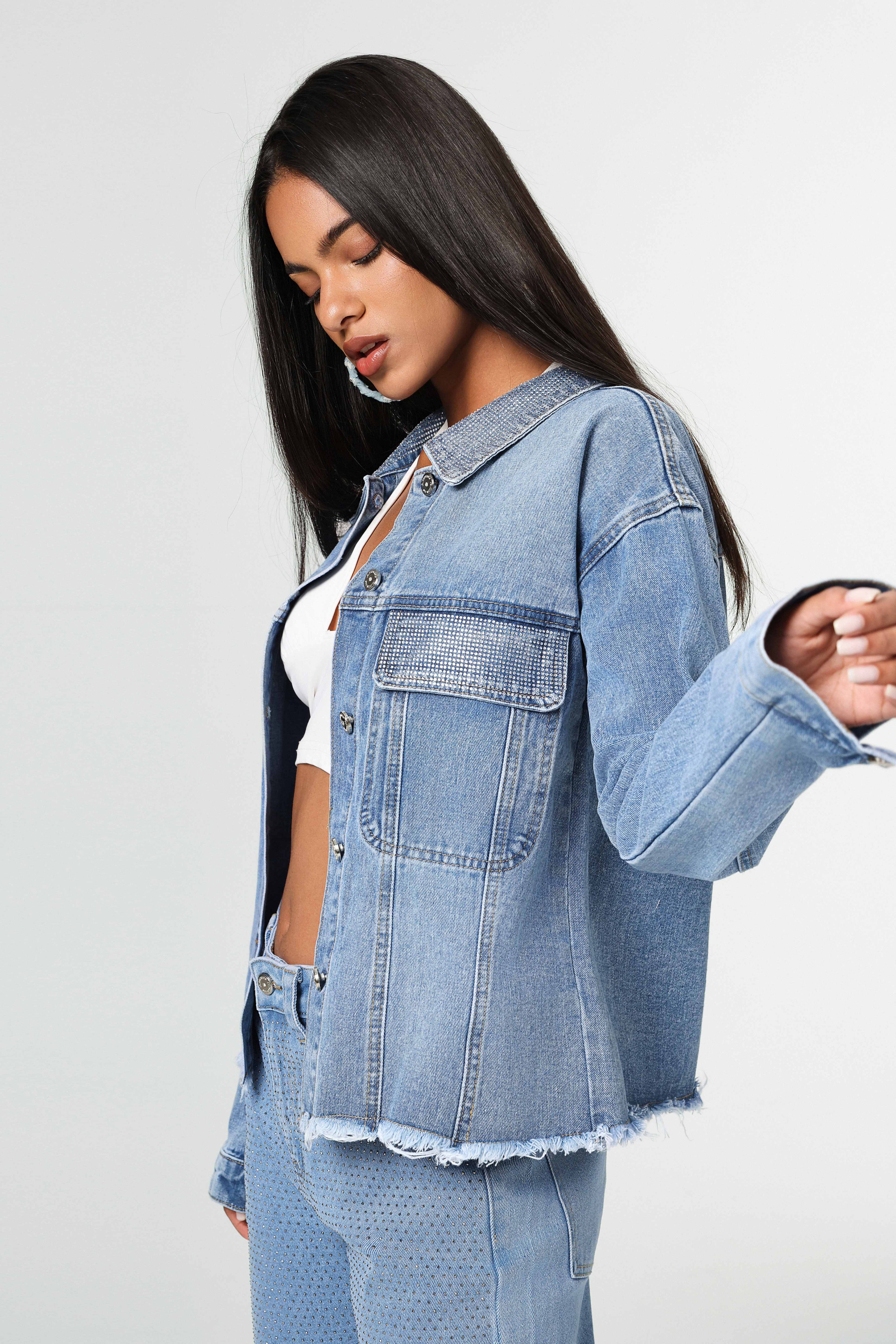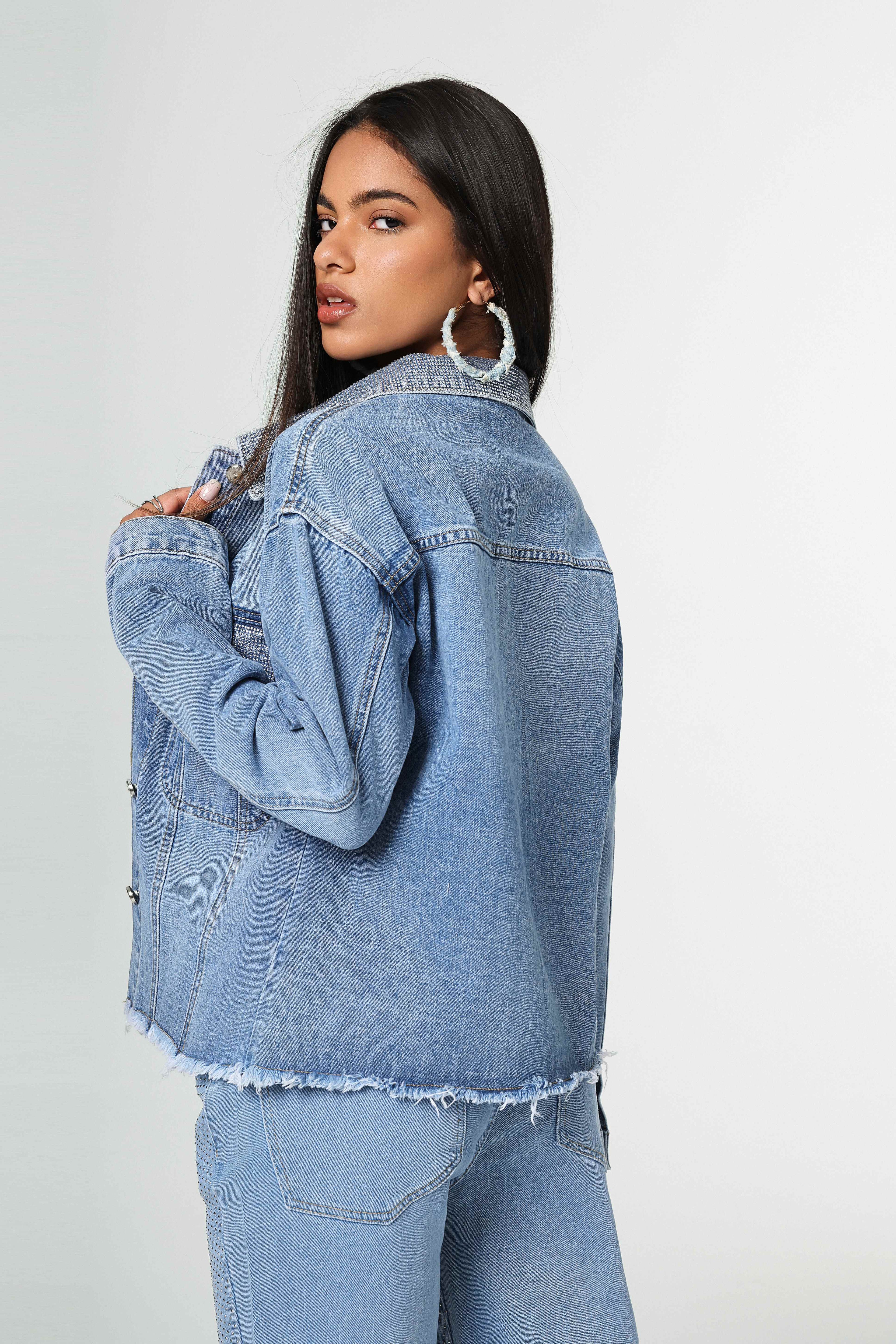 Chaqueta denim azul claro, botones metálicos y bordes deshilachados sutiles