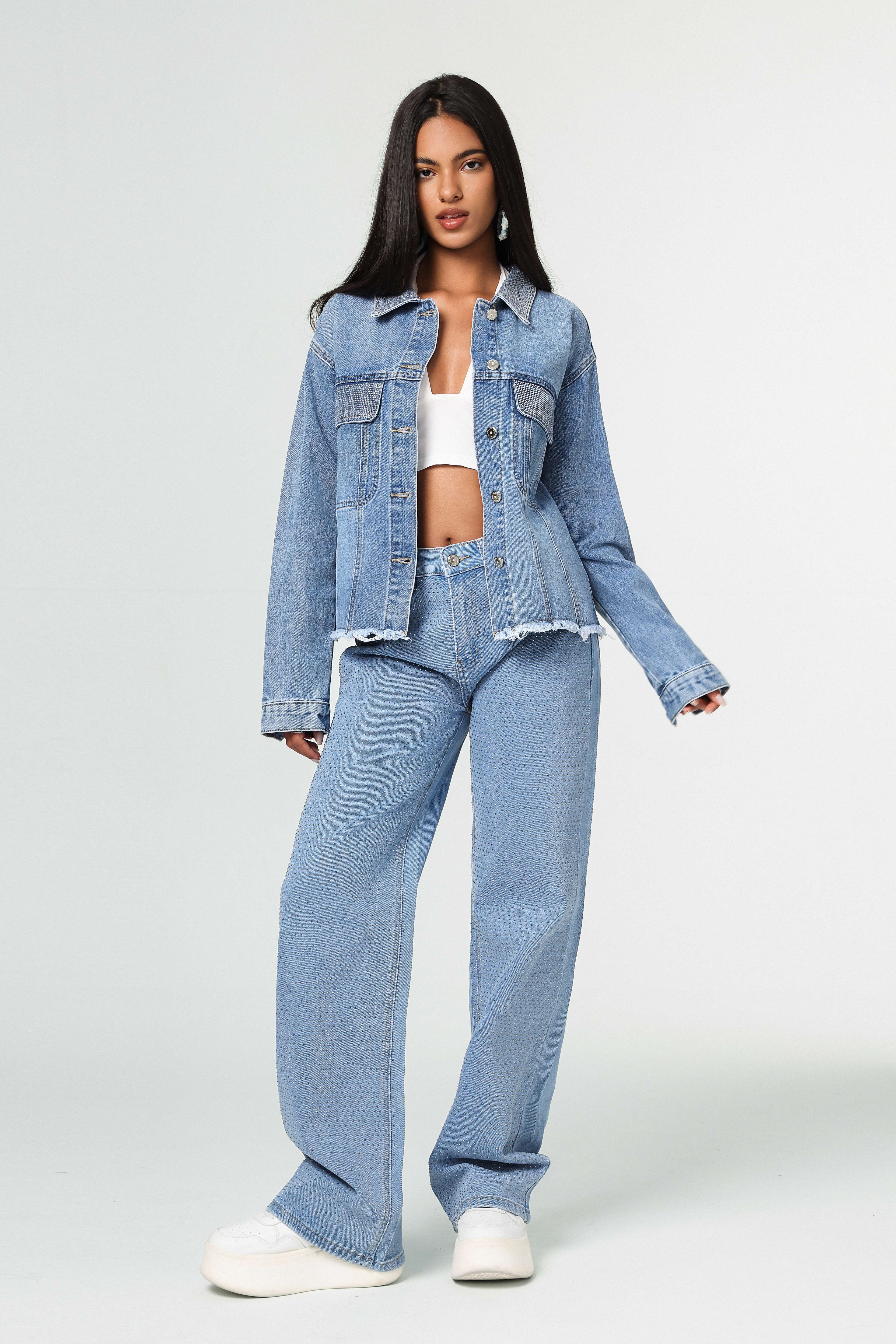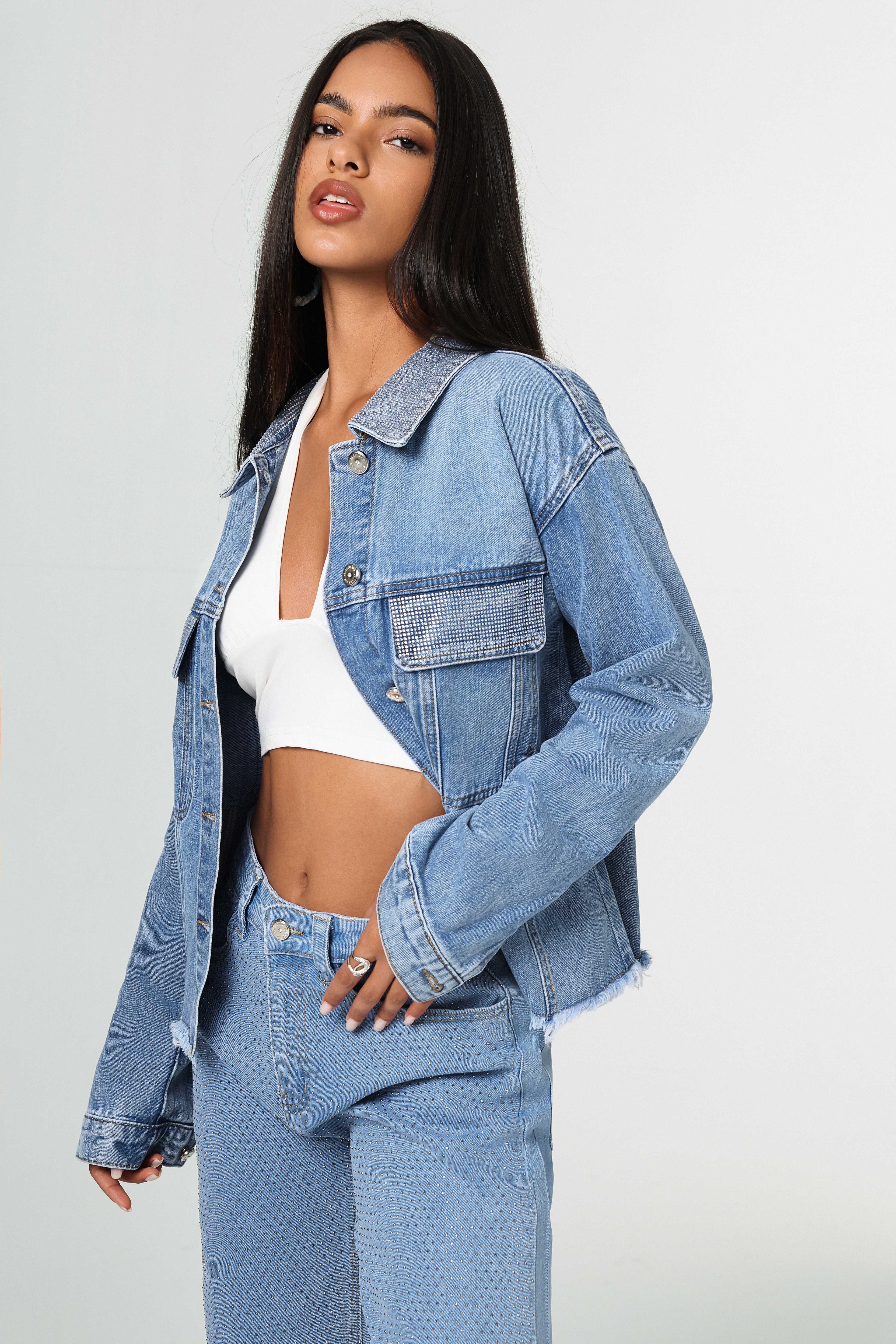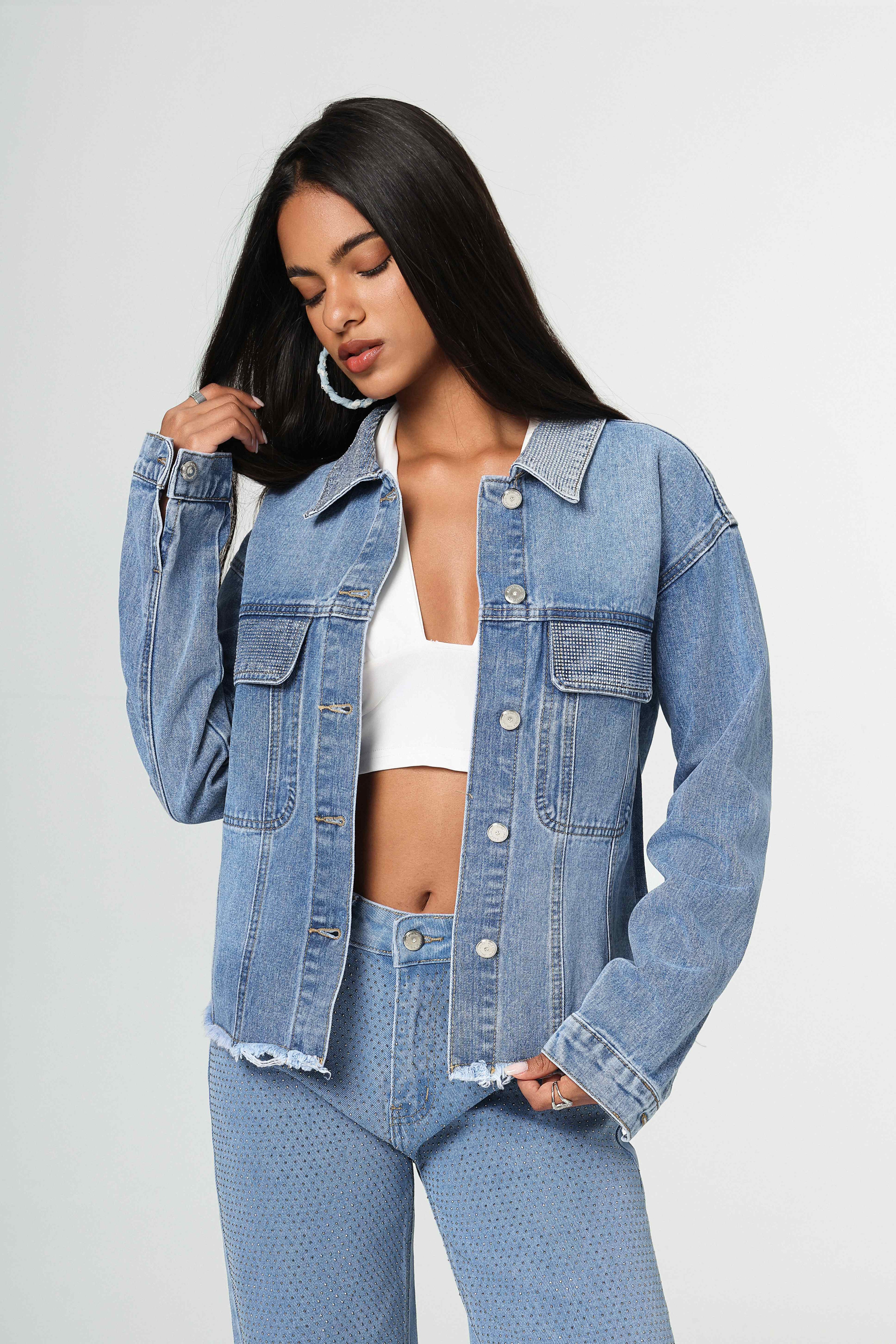 Chaqueta denim azul claro, botones metálicos y bordes deshilachados sutiles
