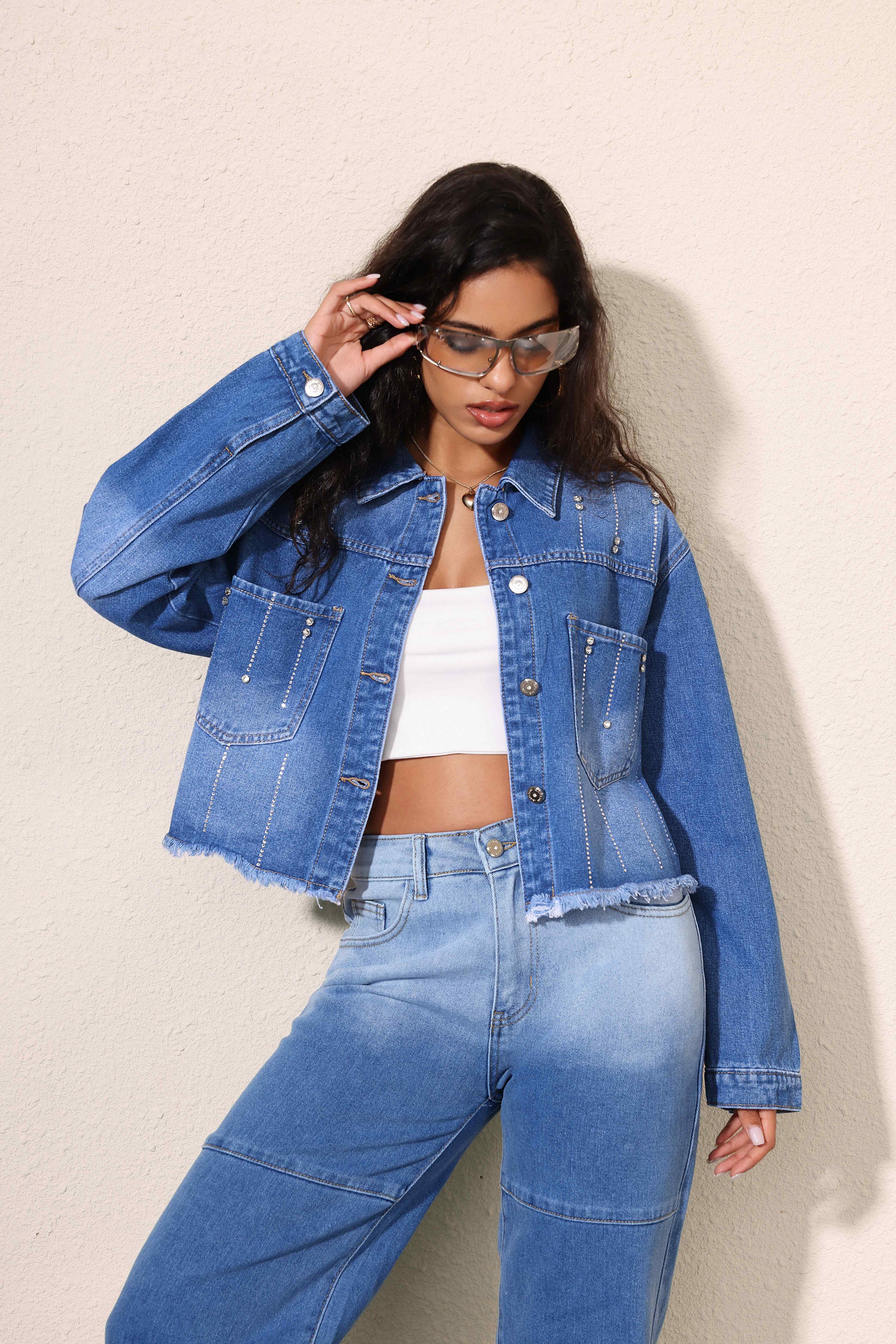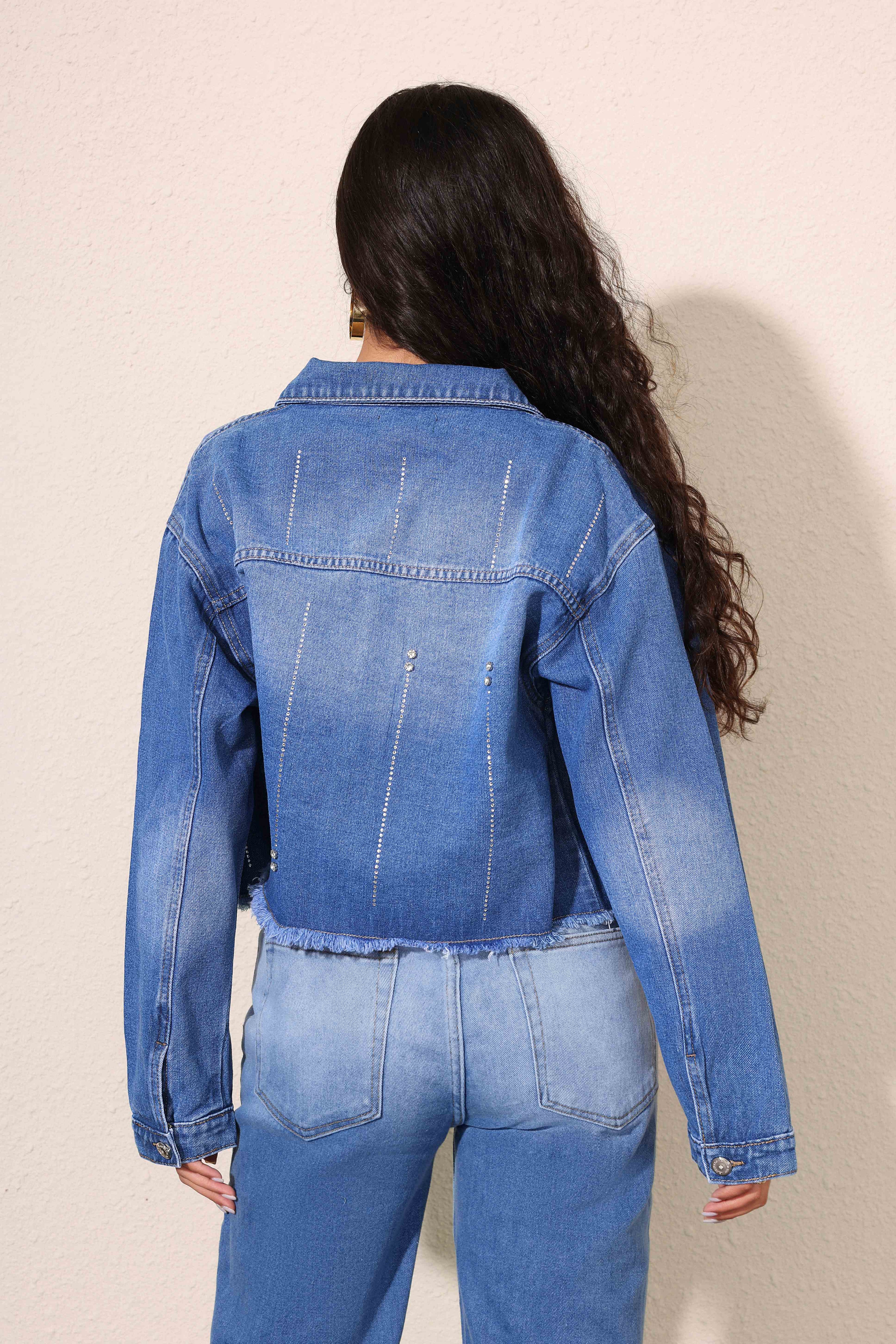 Chaqueta Vaquera con Bordes Dachados Sutiles y Adornos de Lentejuelas para Mujer Estilo Casual