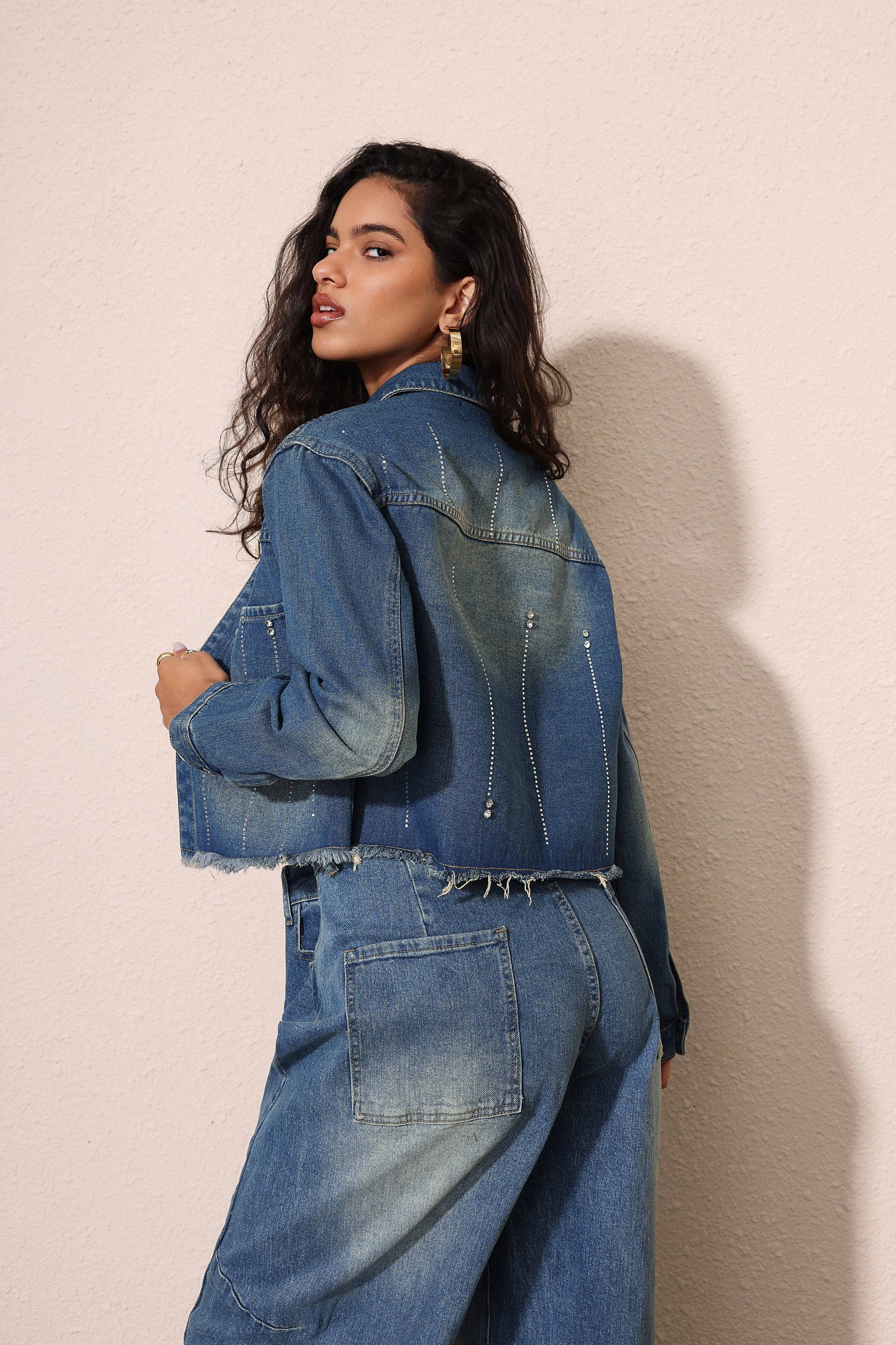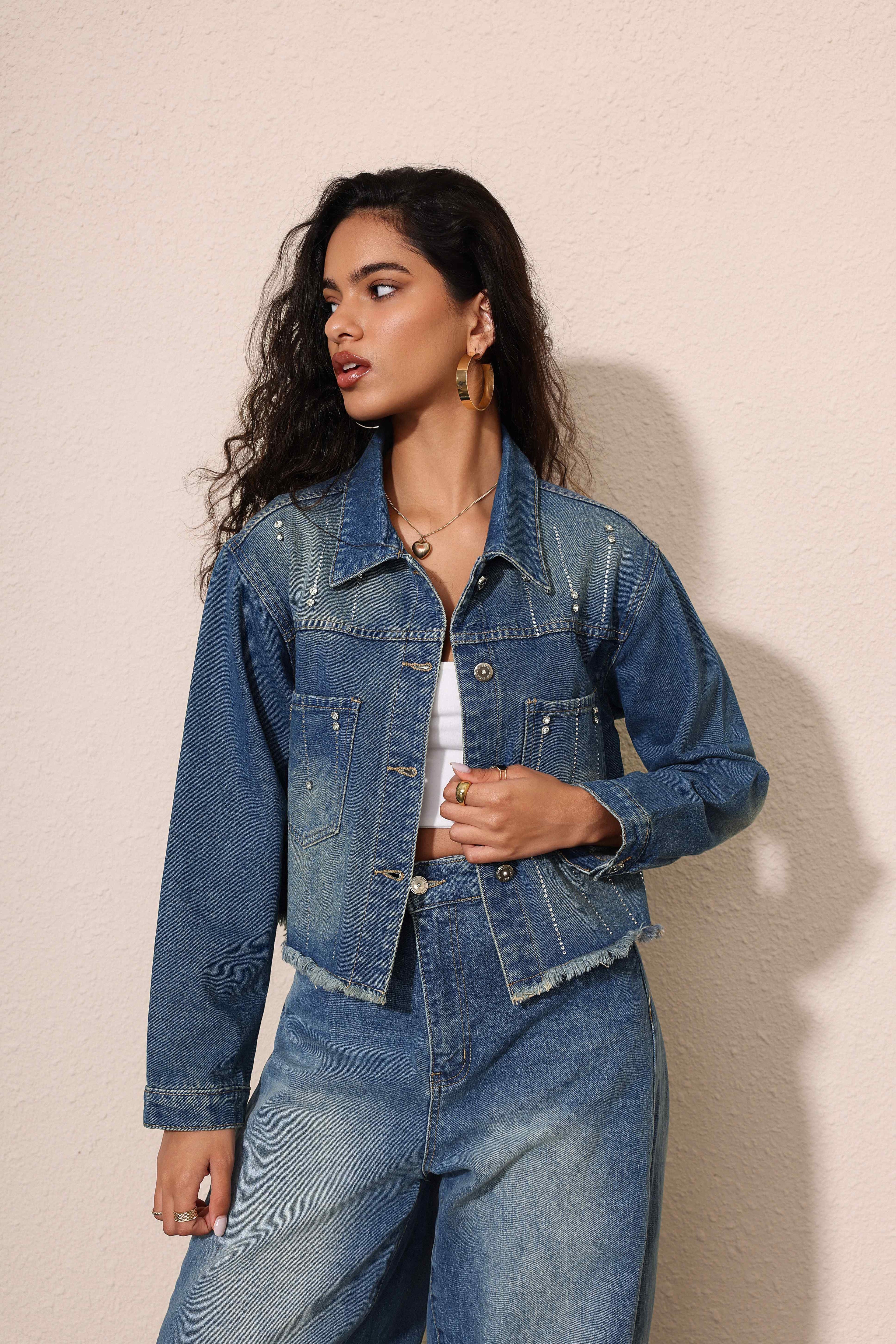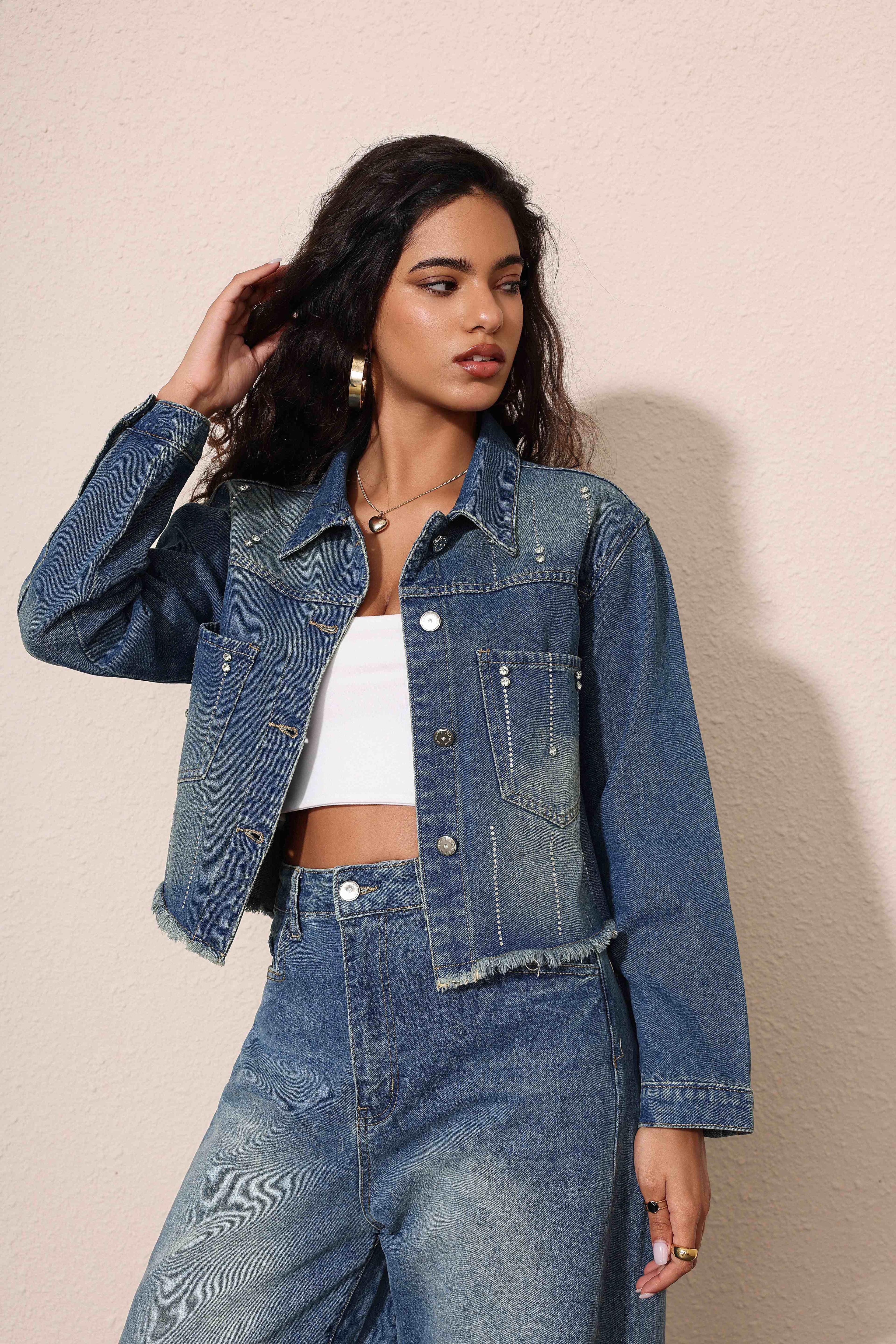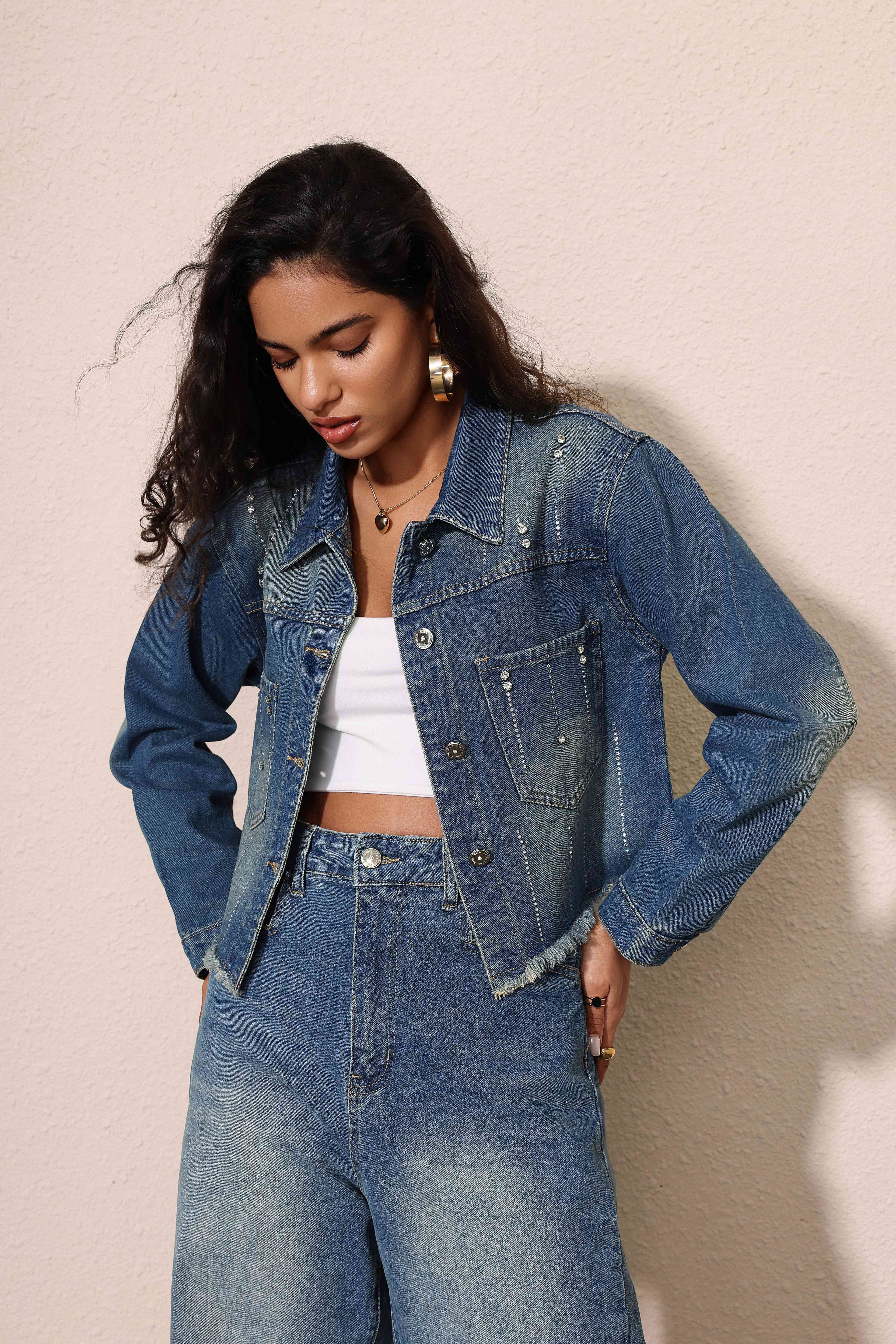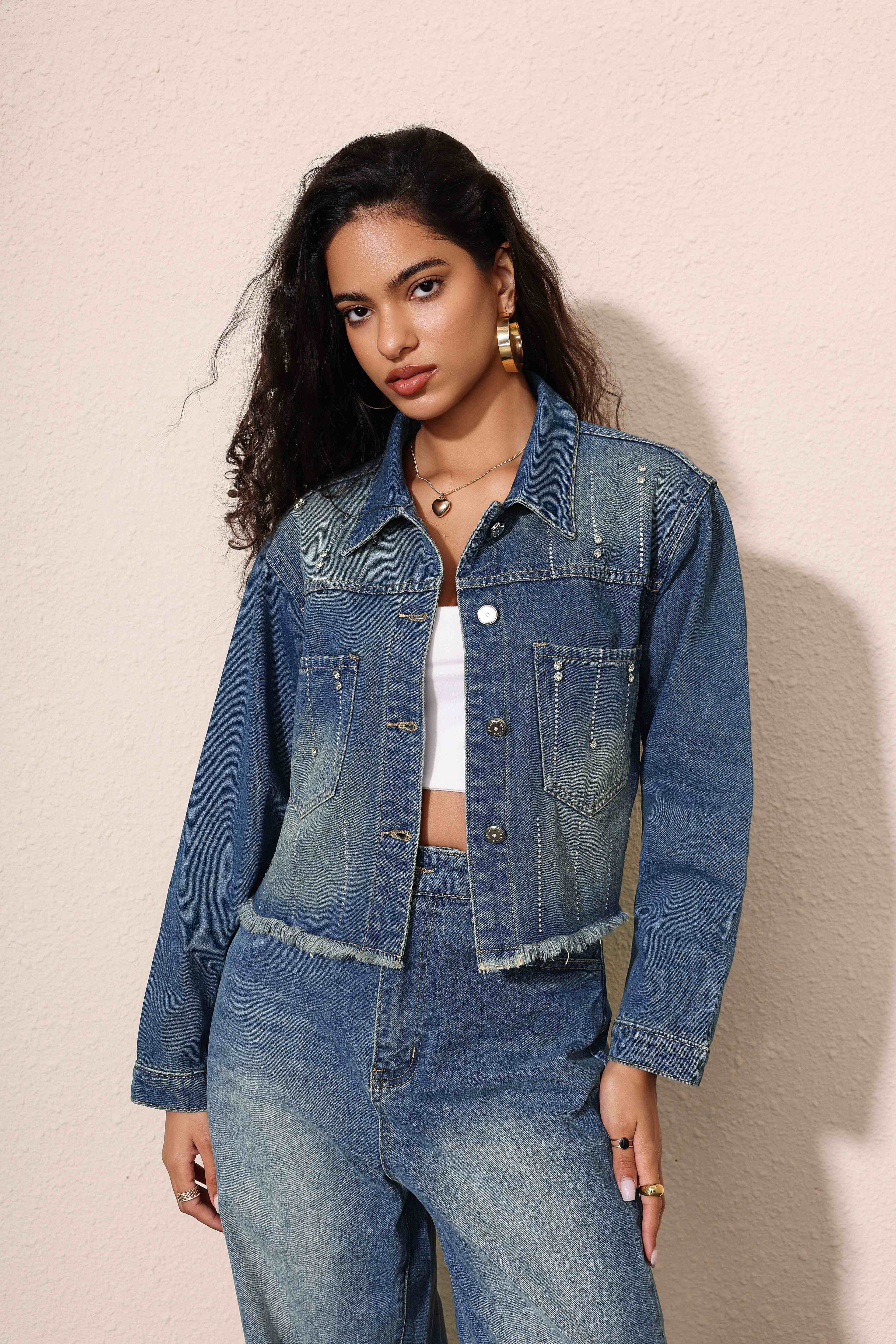 Chaqueta vaquera con decoración de perlas sutiles y bordes deshilachados en la parte inferior