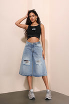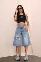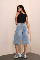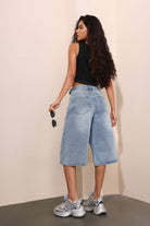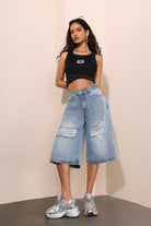 Jeans de Media Pierna Anchos con Lavado Retro y Desgastes Color Azul Claro