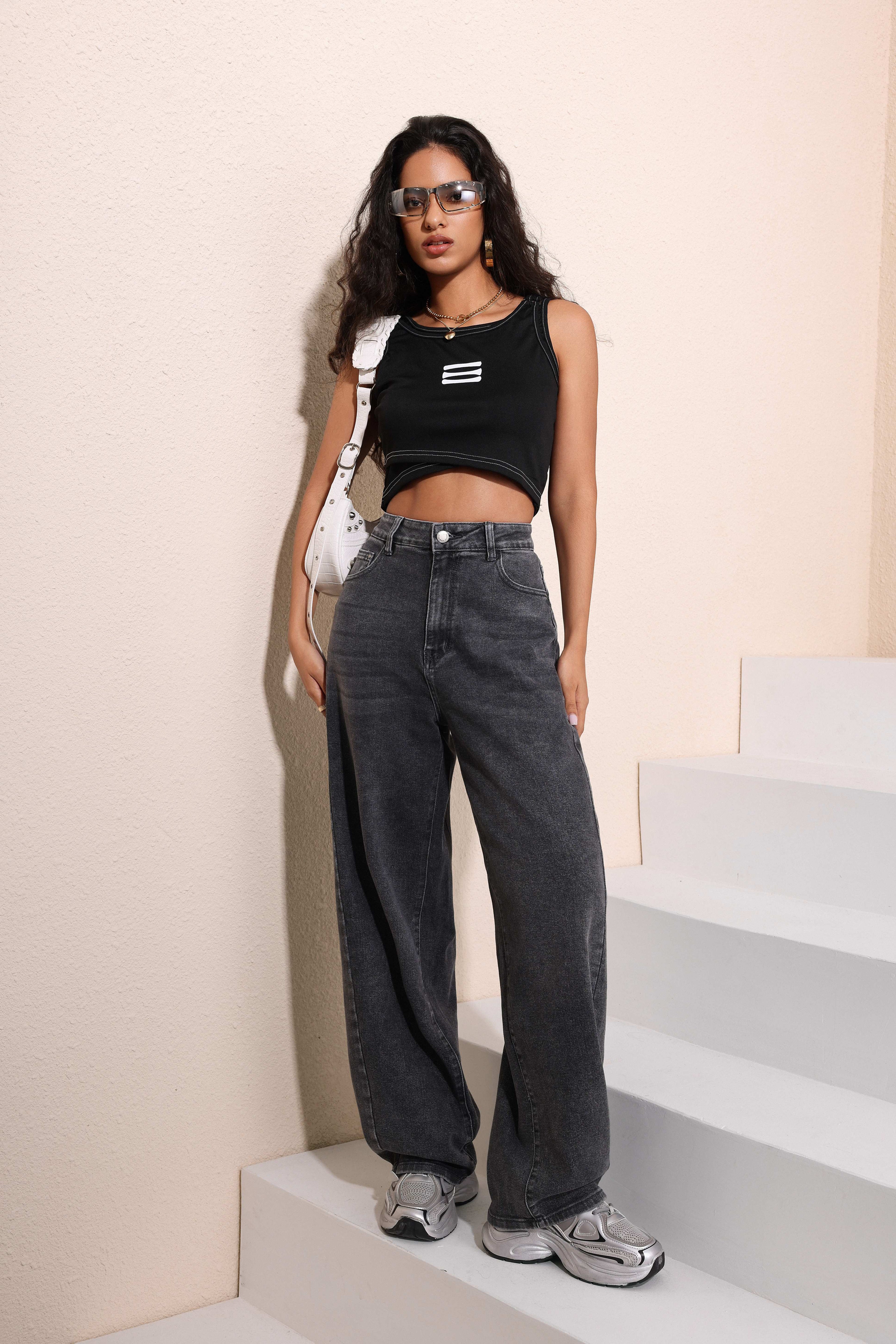 Jeans Amplios de Color Gris Oscuro Corte Relajado y Estilo