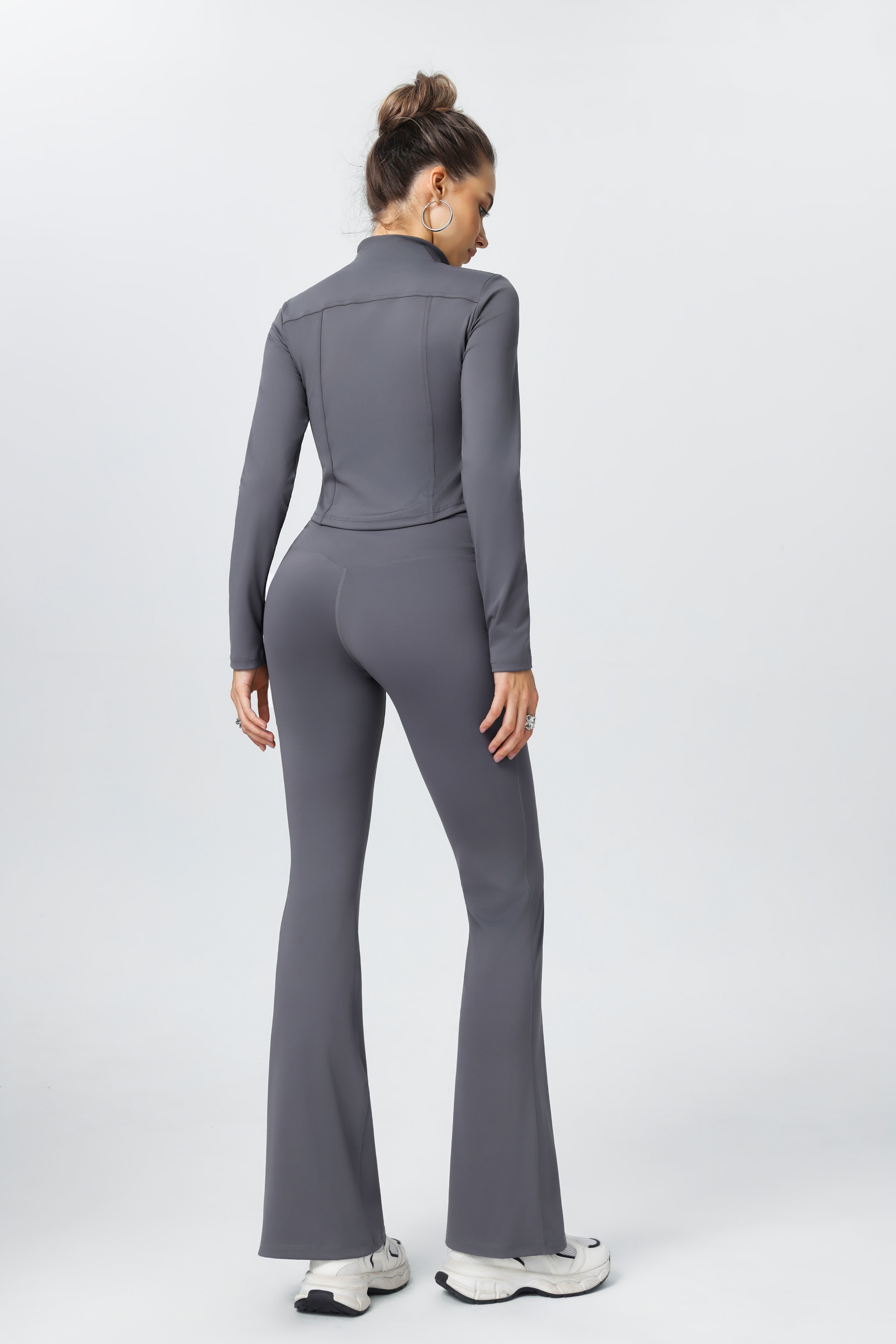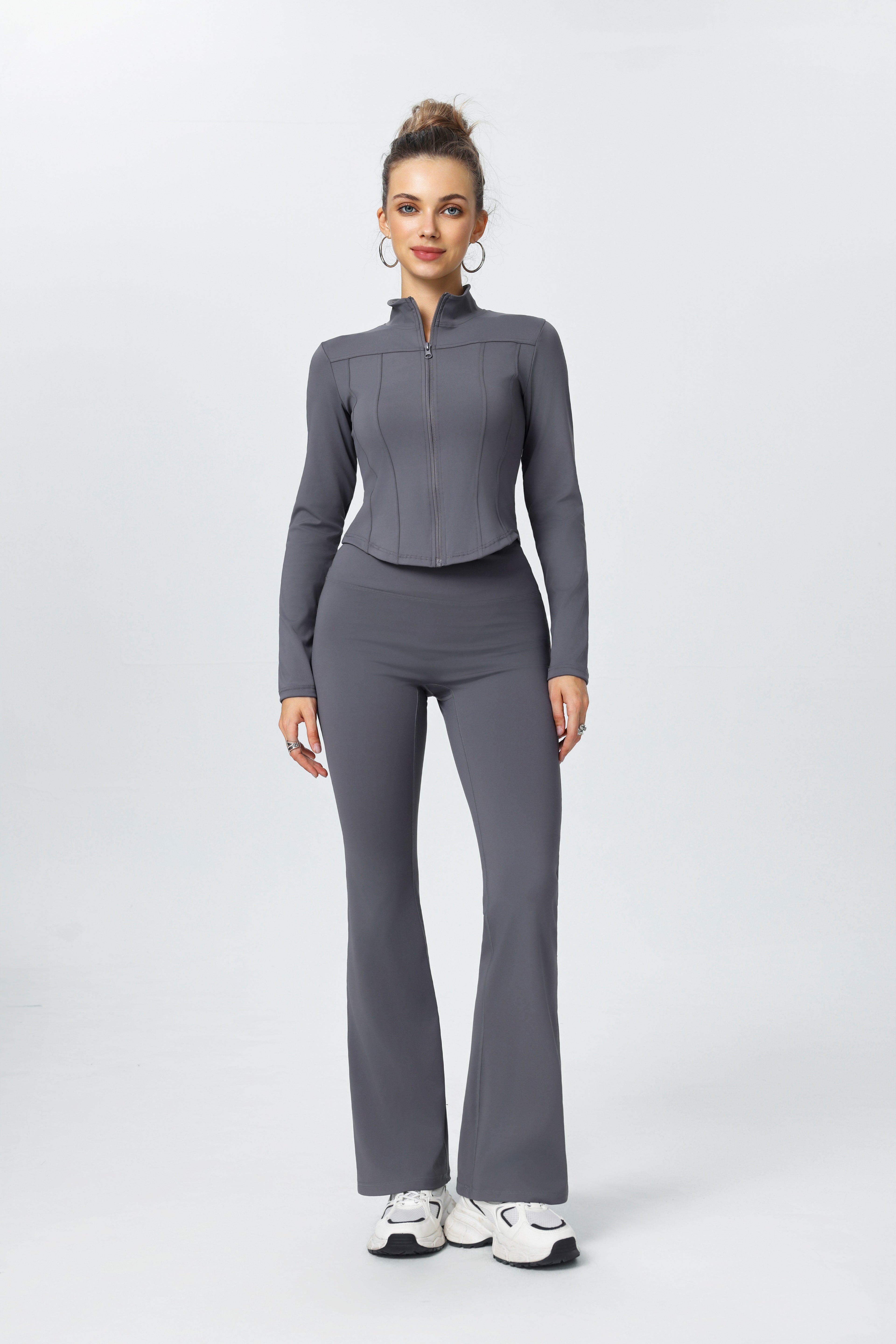 Incluyen pantalones acampanados que complementan el diseño. Este traje de dos piezas es versátil para diversas rutinas de ejercicio. Combina estilo con la necesidad de movilidad y comodidad en cada movimiento.