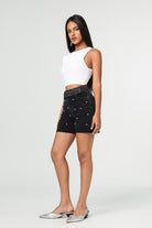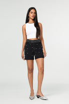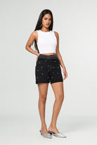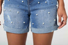 Shorts vaqueros con efecto desgastado, perlas y tira con hebilla